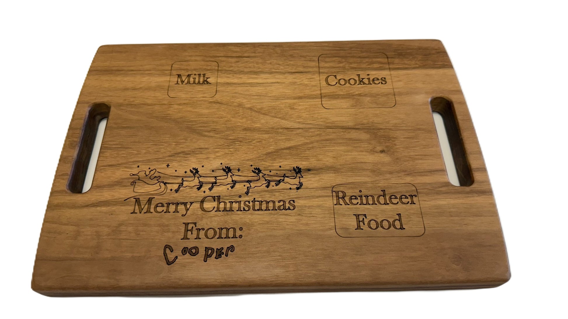 Handcrafted walnut Christmas cookie board, featuring a festive design with "Merry Christmas" and reindeer motifs. Includes labeled sections for milk, cookies, and reindeer food. Sturdy, polished finish with dual handles for easy carrying, perfect for holiday traditions and gifting with a personal touch.